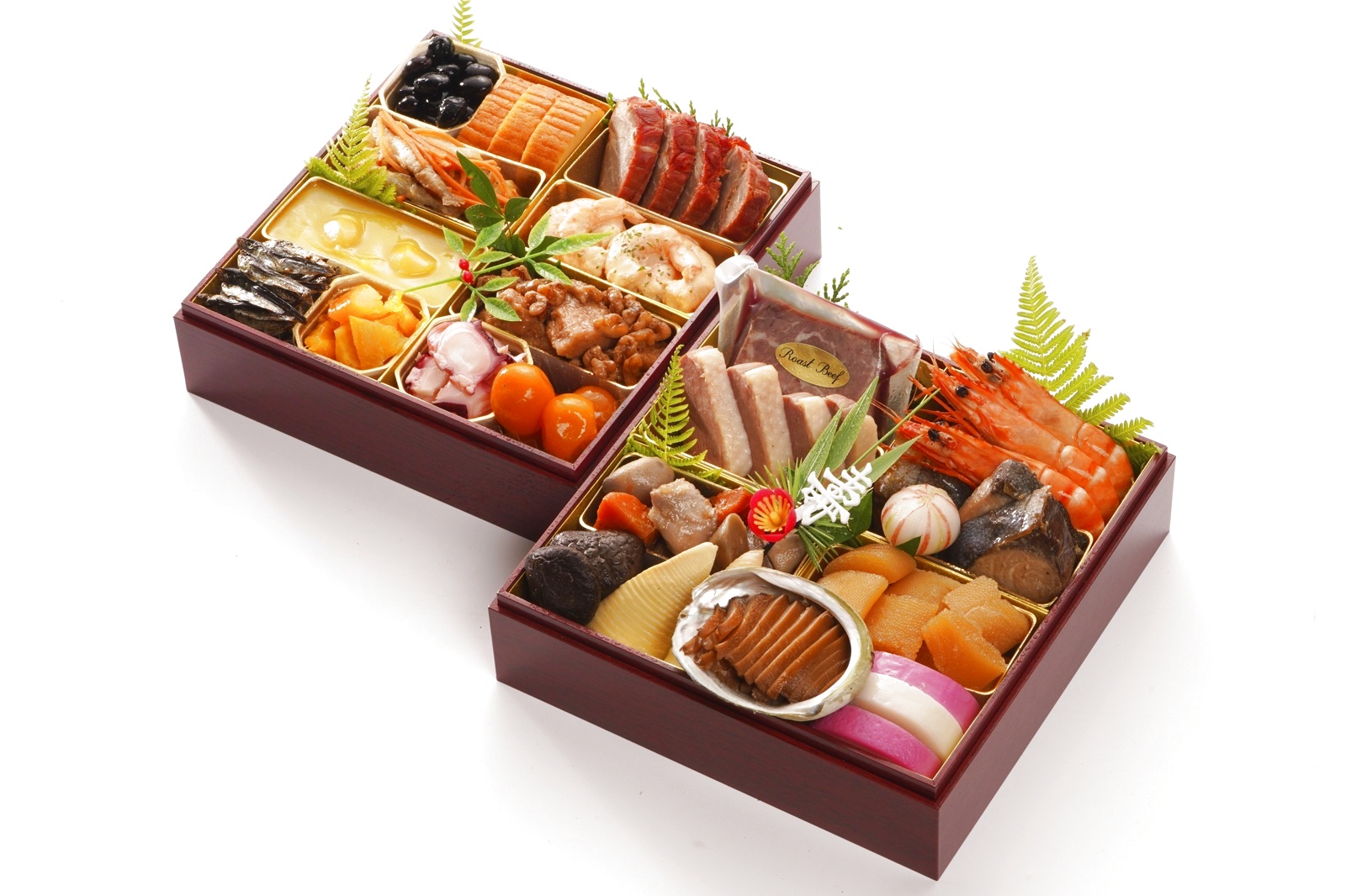 壱の重 | 有頭海老煮 / ローストビーフ(ブロック) / 天然ぶりの照焼 / オードブルダックロース / 数の子 / 地養鶏筑前煮【里芋】 / 竹の子煮 / 椎茸煮 / 煮あわび / 紅白かまぼこ / 手毬餅 |
